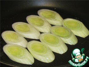 Пока рыбка и фенхель запекаются, немного обжариваем лук-порей с двух сторон на небольшом количестве масла.