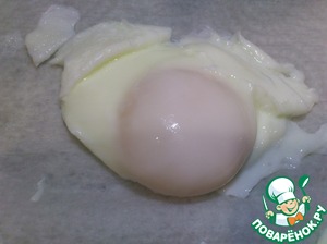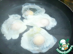Когда вода закипит, разбиваем одно яйцо в чашку и выливаем в сковороду. Затем быстро проделываем то же самое с еще 3 яйцами. У меня не получилось сохранить форму яйца, в идеале яйца должны остаться кругленькими. Тем не менее, вкус от этого не пострадал :)