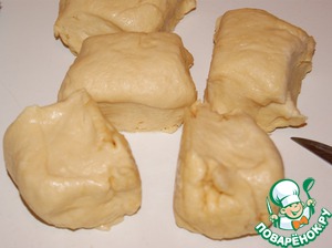 Рабочую поверхность смазать растительным маслом и обмять на ней тесто. Разделить на 6 равных частей.