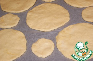 И тогда уже раскатать в красивую и ровную лепешку толщиной 0,5 см, я распрямляла руками; тесто очень мягкое и послушное. Поместить цебуляки на противень, застеленный пекарской бумагой. Я сделала 5 больших и 4 маленьких. Поставить в теплое место на 20 минут.