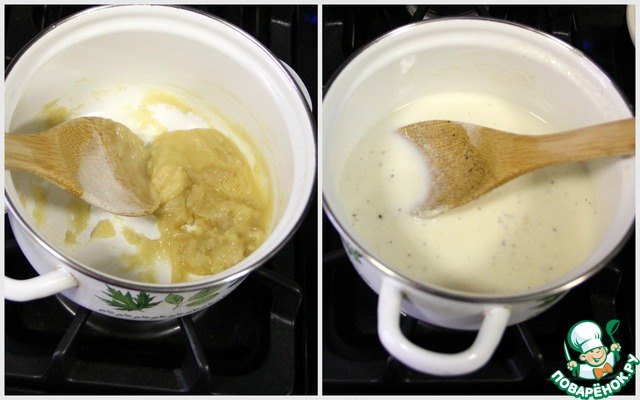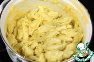 Сначала готовим сырный соус. Для этого растопить сливочное масло, добавить муку и хорошо перемешать. Добавить молоко и готовить, помешивая, на медленном огне до однородного состояния, около 5 минут. Затем добавить сыр и хорошо перемешать.