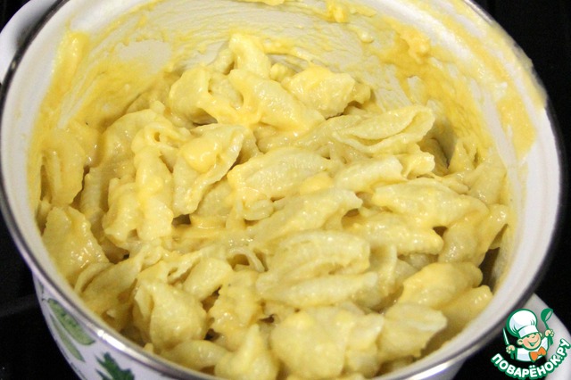 В небольшой кастрюле смешать макароны и сырный соус и готовить около минуты на медленном огне.