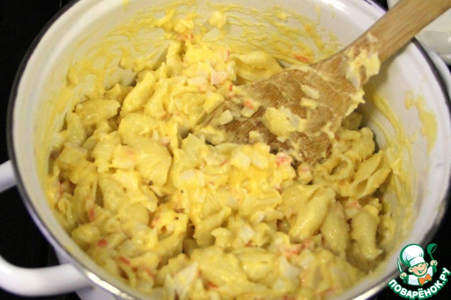И добавить к макаронам. Перемешать. Поставить макароны с крабовыми палочками в холодильник примерно на 2 часа, чтобы смесь охладилась и стала немного твердой.