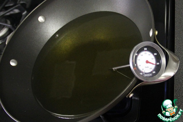 В глубокой сковороде нагреть растительное масло до кипения, до температуры 350F (175 С). Масла должно быть достаточно, чтобы погрузить шарик.