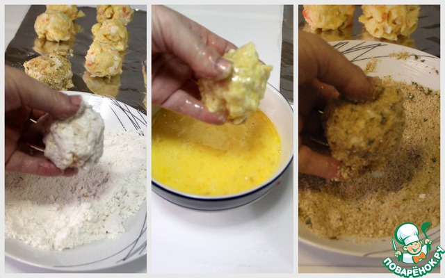 Каждый шарик сначала обвалять в муке, затем окунуть в яйцо и, в последнюю очередь, в хлебную крошку.