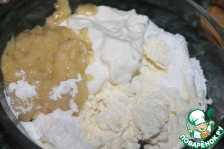 • Смешиваем блендером: творог, сливочный сыр, сметану, сахарную пудру и тёртый банан.