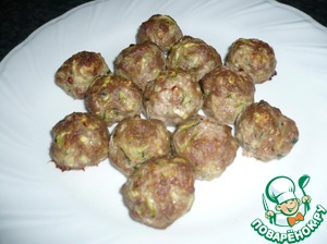 Кабачки натереть на тёрке, смешать с фаршем, солью, перцем. Сформировать маленькие фрикадельки, величиной с перепелиное яйцо, если это маленькая формочка, и величиной с грецкий орех, если большая. Выложить на лист и поставить в духовку примерно на 10 минут, при 180 градусах. Оставшиеся, уже готовые фрикадельки, я замораживаю для следующего раза.