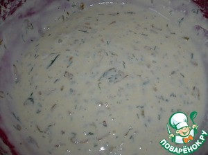 В это время сделать тесто. Взбить яйца с солью. В кефир добавить соду и дать немного постоять, чтобы погасилась. Смешать яйца с кефиром, добавить муку, хорошо вымесить тесто. В конце добавить укроп и жареный лук. -