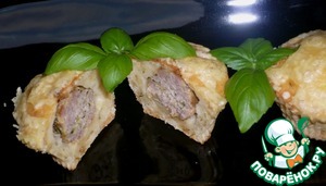 В формочку положить ложкой тесто (меньше половины), положить в середину фрикадельку. Сверху добавить тесто, чтобы наша фрикаделька скрылась, но не до верха! Поставить в разогретую духовку при 180 градусах, на 20-25 минут.
