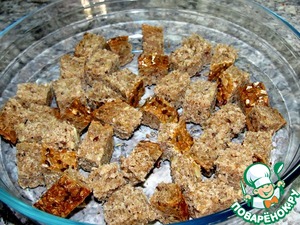 Ржаной хлеб нарезать довольно крупными кусочками и подсушить в горячей духовке.