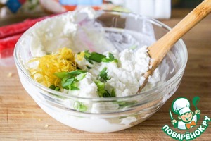 В рикотту добавить мелко нарезанный лук, лимонную цедру, соль и перец по вкусу, чайную ложку подготовленной заправки, слегка перемешать.