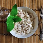 Салат следует подавать сразу после приготовления. Крабовые палочки придают этому салату сладковатый оттенок, вместе с рикоттой они составляют приятный по вкусу и консистенции тандем, а яблоко, будучи единственным твердым составляющим, дает кислинку, вносит разнообразие и выгодным образом подчеркивает вкус остальных ингредиентов.