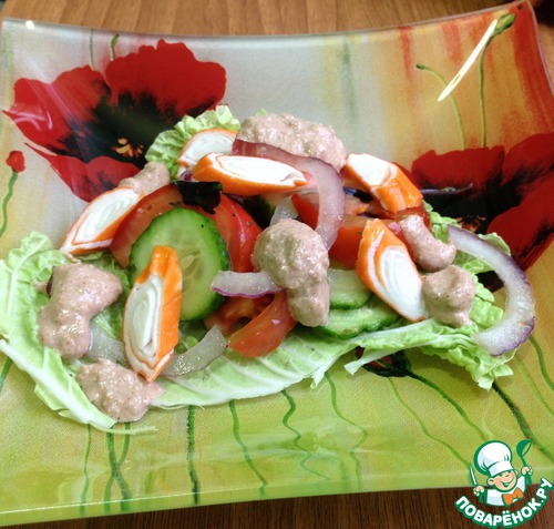 В тарелку порвать немного листового салата, сверху выложить салат, украсить крабовыми палочками и полить соусом
