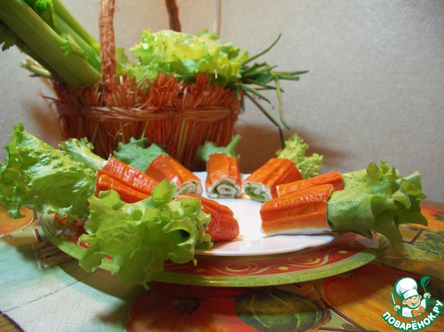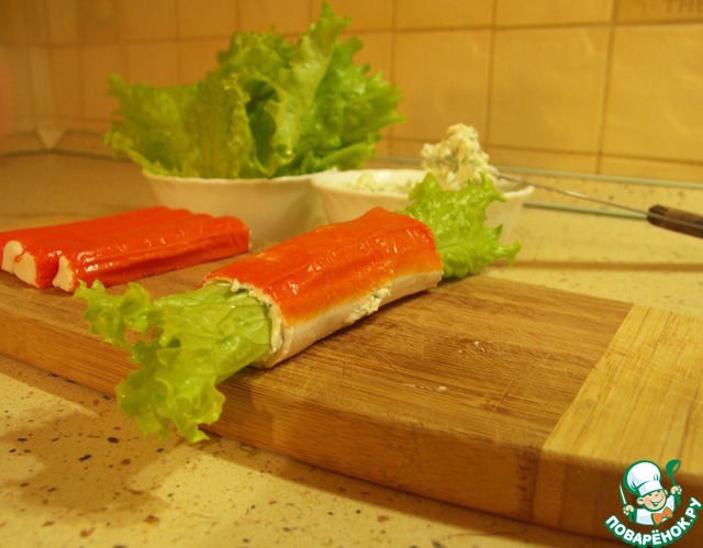 Крабовую палочку развернуть, намазать всю поверхность сырной массой