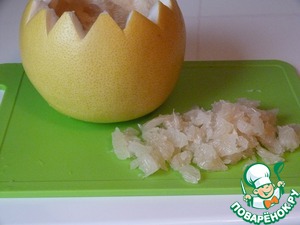 Мякоть помело отделяем от пленки и нарезаем небольшими кусочками.