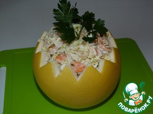 • Салат выкладываем в "вазочку" из кожуры помело. Украшаем зеленью.