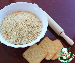 Печенье измельчить удобным для вас способом, я сложила печенье в полиэтиленовый пакет и покатала по нему скалкой.