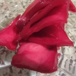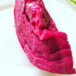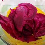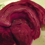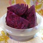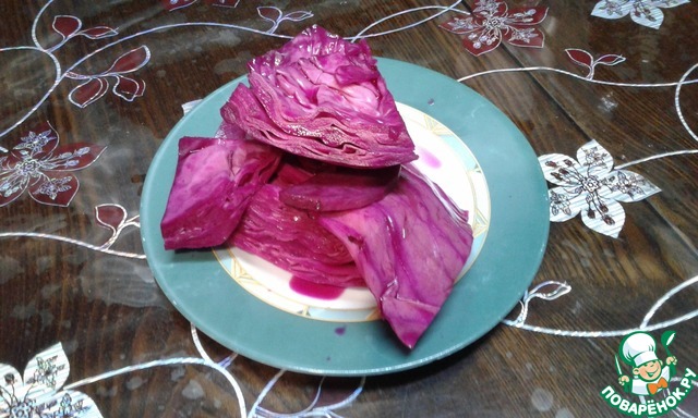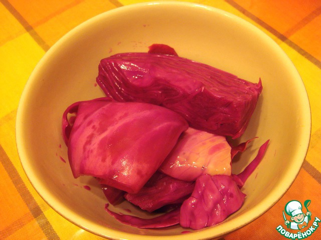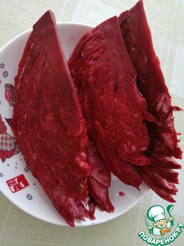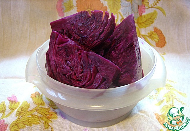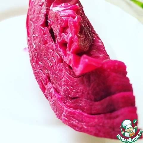 Капусту нарезать некрупными дольками вместе с кочерыжкой. Маленькие кочаны я режу пополам, а потом каждую половину на 3 части. Можно резать и крупнее, но капуста должна хорошо прокраситься, а крупным кускам это сложнее