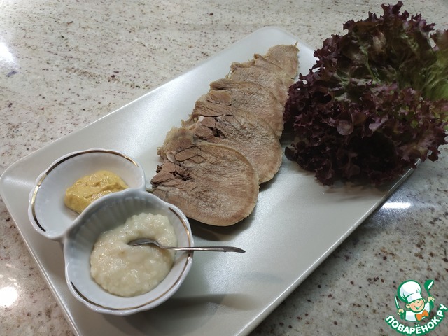 Проверяем на готовность - просто протыкаем вилкой. Если входит легко, значит готов. Если нет - довариваем. Вынимаем язык из кастрюли и немедля подставляем под струю холодной воды минуты на 2.