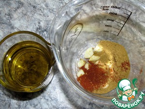 Мелко нарезанный чеснок, зиру и паприку взбиваем блендером, понемногу добавляя оливковое масло. В конце добавляем винный уксус и еще 1 минутку взбиваем.