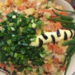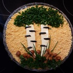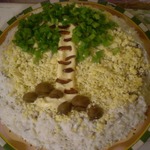 Сразу оговорюсь: идею украшения нашла в интернете пару лет назад, автора не знаю! (можно ли выкладывать такие варианты, я тоже не в курсе :-) ). Но украшение данного салата надолго стало коронным в нашей семье. Помню тот ажиотаж, когда впервые приготовили такой вот салатик маме на ДР ;-). Вариант оформления, может, и не новый, но, просмотрев все украшения блюд на этом сайте, я его не встретила. Вот и решила поделиться