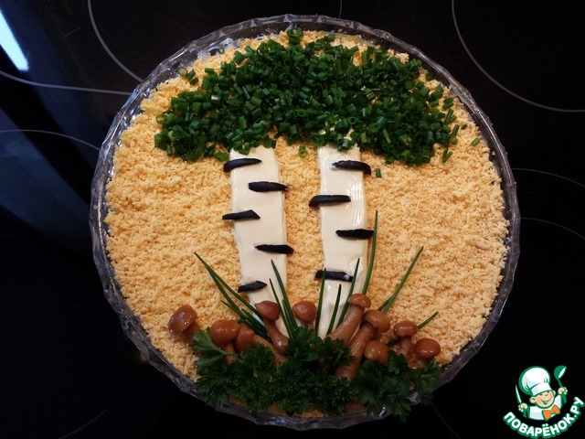 Далее необходим майонез в пакетике. Отрезаем уголок пакетика и посредине салата выдавливаем две полосочки, имитируя стволы наших березок). Мелко порезать оливку и выложить ее в "стволы березовые". Лук зеленый порезать мелко и посыпать на салат - сделать крону дереву. а под березой выложить маленькие грибочки (опята смотрятся лучше всего, надо выбрать из банки самые маленькие). украсить внизу тоже можно луком оставшимся или петрушкой. Вот такая вот получается роща! Очень оригинально, по-моему! ОГРОМНОЕ СПАСИБО АВТОРУ данного украшения!