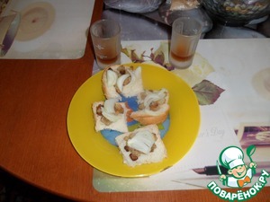 Собираем канапушечки. Свежий хлебушек. Поперченные и присоленные шкварочки, репчатый лучок. Можно и по 25 гр за успех блюда. Нисколько не пропагандирую алкоголизм. Но... Если Вы собрались готовить данный рецепт 6 часов на кухне - следовательно, ура! выходной! Ну почему бы не совместить приятное с полезным?