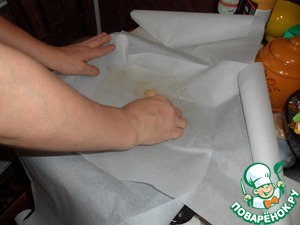 Собираем нашу конструкцию. Кладем на противень крест накрест листы пекарской бумаги, смазываем ее оставшимся салом со сковородки.
