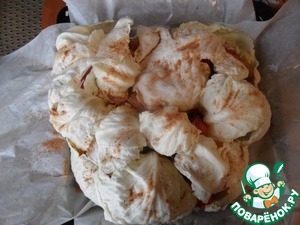 Далее выкладываем вторую половинку капусты, солим, перчим, мажем маслом.