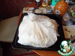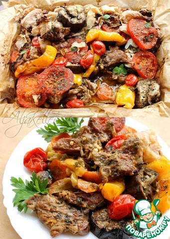 Рецептик взят из книжки Сталика Ханкишиева. Сталик решил приготовить в духовке аналог блюда кочевников. Разделанное мясо барана укладывали в подготовленную ошпаренную шкуру без шерсти, добавляли лук и что бог пошлет, увязывали в узел и закапывали под костром. Костер жгли долго. А утром выкапывали шкуру и кушали. То есть, мясо готовилось длительное время с постепенно падающей температурой. Роль шкуры выполнила у Сталика пекарская бумага, а роль постепенно затухающего костра - духовка.