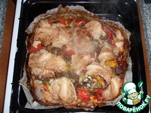 Затем вытаскиваем противень, разрезаем бумагу.