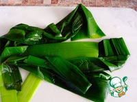 Свободный угол заполнить натёртым крабовым мясом с желатином. В середину так же положить крабовую палочку, упакованную в лист нори. Поставить в холодильник на 1-2 часа. Когда террин остынет, нужно достать его из холодильника и аккуратно достать из формы, перевернув на доску. Если с первого раза не получилось, подрежьте по краям ножом, тога уж точно выпадет))). После этого наш прямоугольный террин нужно обернуть листьями лука-порея, обмазать их сверху желатином, чтобы они красиво блестели. Поставить окончательно застывать в холодильник. |