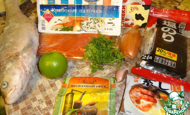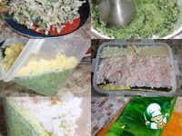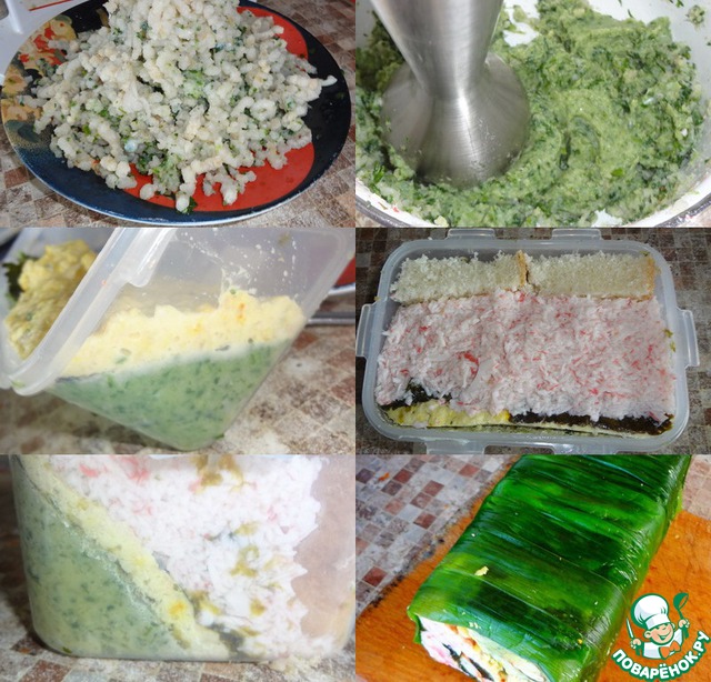 Нужно взять пластиковую квадратную форму и один угол заполнить фаршем судака со шпинатом. В середину положить крабовую палочку, упакованную в лист нори. Положить на слой фарша из судака (зелёного) лист нори. На нори положить фарш судака со сливками и шафраном (жёлтый цвет).