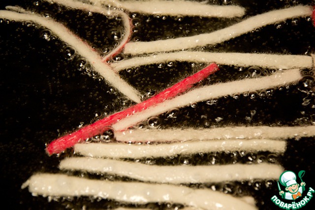 Решила попробовать приготовить чипсы, или хворост, из крабовых палочек. Надо сказать, что ожидания мои остались далеко позади результата. Хрустящие, воздушные, с ароматом крабов. На радостях презентую бонус к рецепту — салат с их участием.
