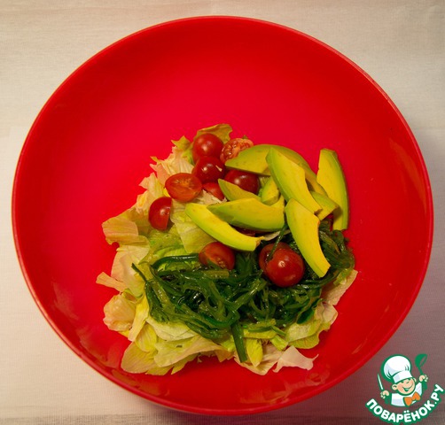 Теперь обещанный бонус - делаем салат. Салат «Айсберг», водоросли чука, авокадо, помидорки черри соединить в желаемой пропорции. Перемешать. Мешайте руками - в этом нет ничего страшного, даже наоборот, вы с салатом прочувствуете друг друга=)