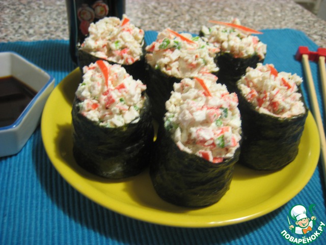 Я большой любитель японской кухни. Хочу представить вам Гункан-Маки Gunkan-machi, (в переводе рулет - военный корабль) - это разновидность суши, представляет собой спрессованный ладонями рис, обрамлённый по периметру полоской нори для придания ему формы корабля. Чаще делается с крабовым мясом и летучей икрой. Это очень вкусно и просто в приготовлении.