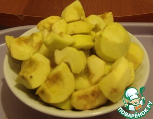 600 грамм очищенных яблок режем на дольки. У меня яблочки были небольшие, я разрезала их на 4 части