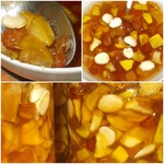 Смешиваем в кастрюле яблоки (те, которые дольками), оставшийся сахар, сок и цедру лимона, курагу и миндаль. Даем постоять 20 минут