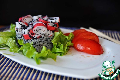 Не буду претендовать на то, что этот салат относится к японской кухне. Но идея его приготовления очень заинтересовала меня, главное, что готовится легко и быстро, должен понравиться любителям суши. Рецепт заимствован с сайта Нины Niksya, за что выражаю огромную благодарность его автору.