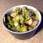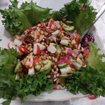 На лист салата или на тарелку выложить все ингредиенты, посыпать кедровыми орешками и полить заправкой! Приятного аппетита!