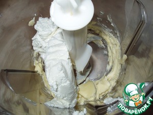 В блендер или комбайн положить размягчённое масло и взбить добела. Добавить творог. Ещё раз взбить.