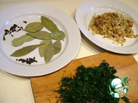 Сверху кладется лук, по 1-2 лавровому листочку, перцу горошком и гвоздичке. |