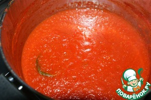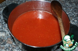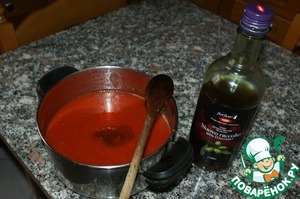 В соус добавляем оливковое масло. Ставим на медленный огонь, готовим около часа без крышки, вот тут время приготовления зависит от помидор. Даем испариться жидкости из соуса - и чем больше, тем лучше.