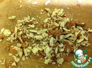 Скалкой проходимся по миндалю, мелко крошить его не надо, и добавляем к тесту, хорошо вымешиваем
