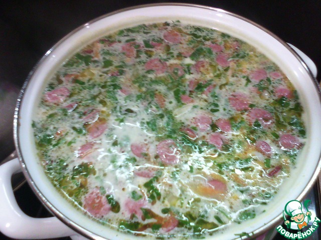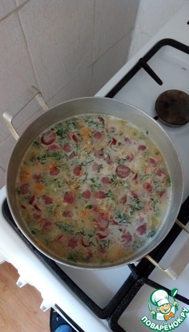 Рецепт «Сырный суп с охотничьими колбасками»: