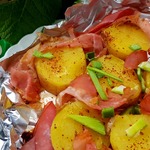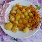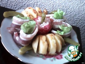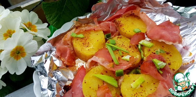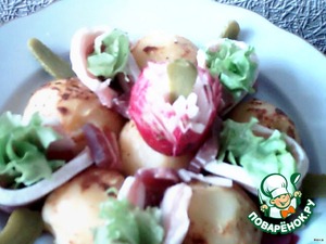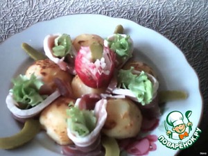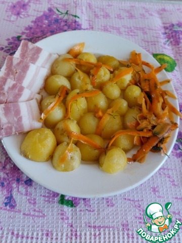 Отваренный картофель в кожуре режем на 2 части, укладываем на противень и запекаем в микроволновке 10 мин. на 100 % мощности. Бекон тонко режем (или берем в магазине нарезанный). Картошечку после запекания чистим, укладываем на тарелку, добавляем бекон, чуть поливаем маслом, украшаем, солим и перчим по вкусу...