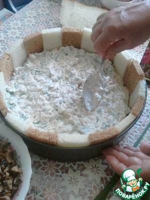 2й слой: грибы жареные, перец, соль + 1/3 основы. Выкладываем на 2ой слой хлеба. Закрываем 3-им слоем хлеба.