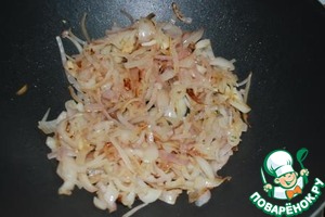 8. Когда вы убедитесь, что мясо уже вполне дозрело, приступайте к обжарке лука. Возьмите любую толстостенную емкость (сотейник, казан и т. п., у меня вок), налейте немного растительного масла и обжаривайте лук до золотистого цвета.