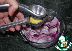 Выдавить сок лаймов. У меня есть совершенно замечательное приспособление для этой операции, которое у меня проходит под названием «ни капли врагу», т. к. выдавливает сок практически досуха и косточки не пропускает. Если нет лаймов, то можно использовать лимон. На данное количество лука одного лимончика среднего размера будет достаточно.