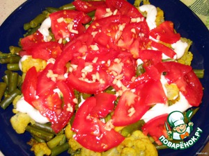 Вкусненький, сытненький салатик, который можно очень быстро приготовить к приходу неожиданных гостей или просто себе на ужин... Немножко стручковой фасоли и цветной капусточки с пряностями, помидорчик, чесночок, капля майонезика, сыра... Судите сами.